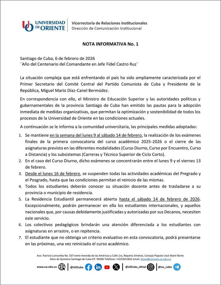 Nota Informativa No. 1 de la Universidad de Oriente sobre las medidas aprobadas ante el contexto actual