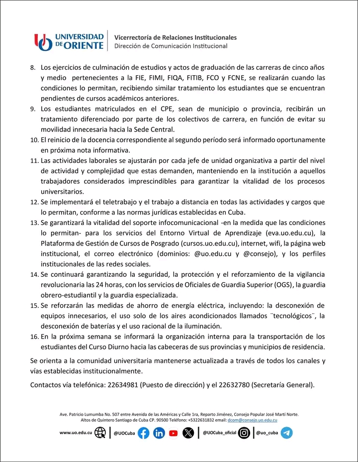 La Universidad de Oriente informa a su comunidad universitaria las medidas aprobadas por el Consejo de dirección ante la complejidad del contexto actual.